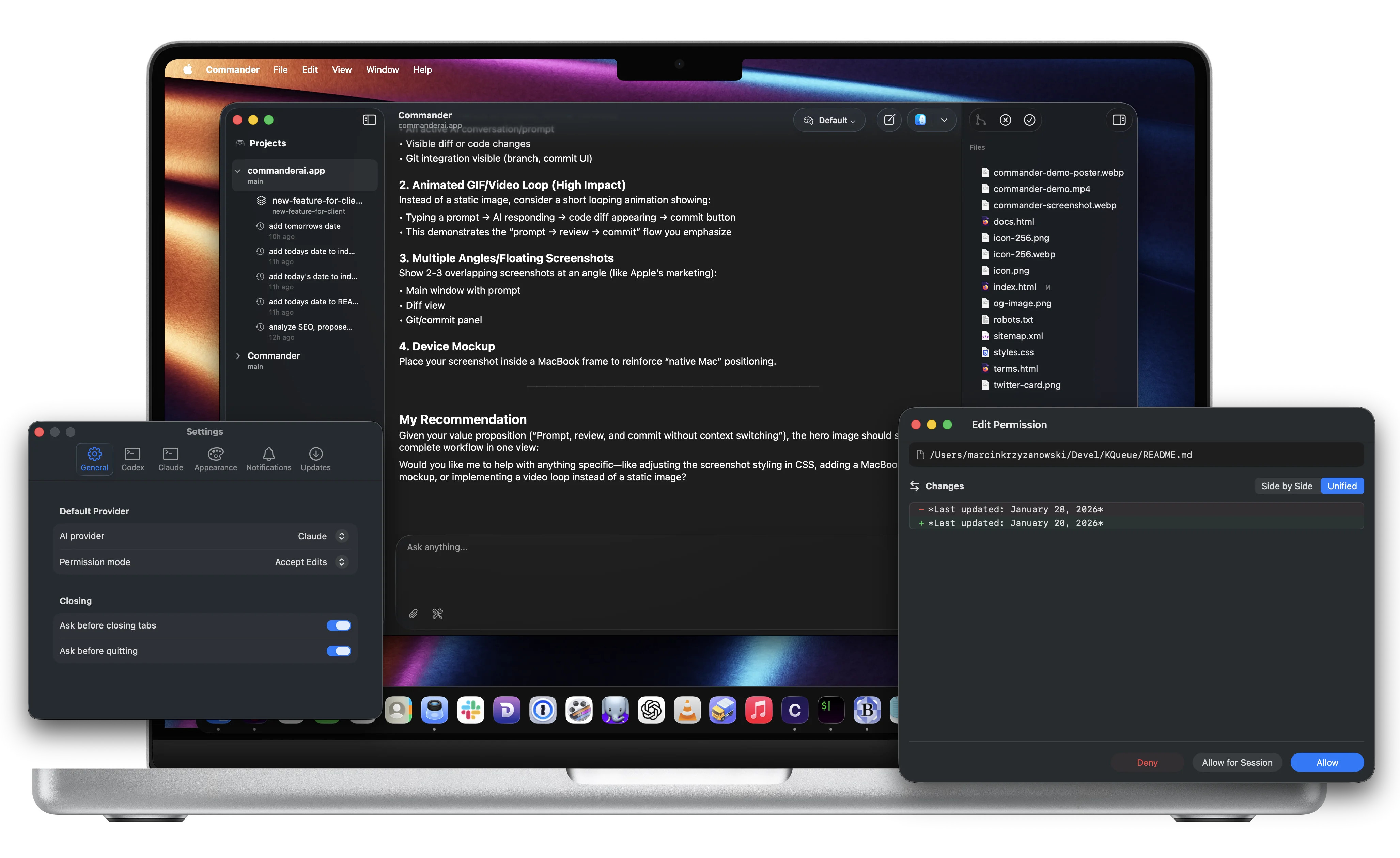Commander connects to your local Claude Code CLI and provides a native macOS interface for code generation, refactoring, documentation, and more. It includes an integrated git workflow for seamless version control.